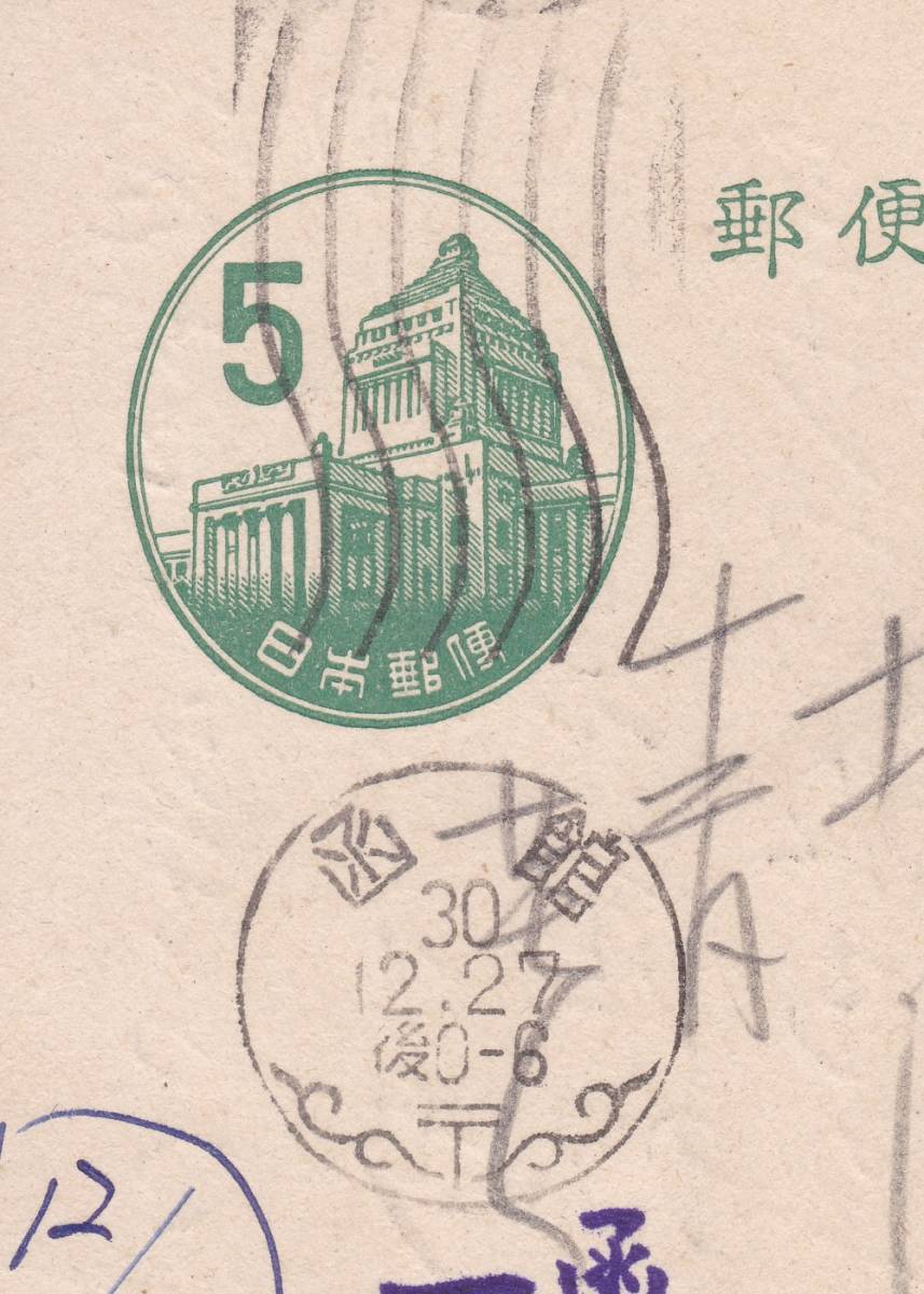 - t0017★唐草機械印/函館30.12.27後0-6/5円葉書