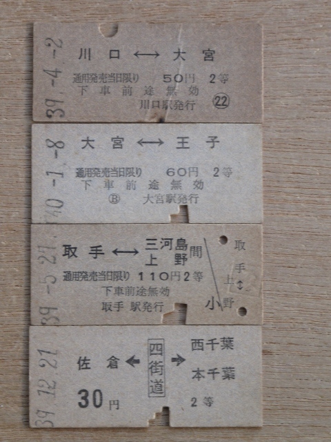 - 昭和39・40年 国鉄 首都圏 矢印式 乗車券 4枚 硬券 四街道駅 川口駅