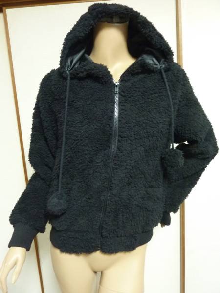 > 匿名配送 送料無料 新品 チカリンダ ふわふわ もこもこ パーカー フード付き ブラック 黒 レディース ボンボン付 ジップパーカー アウター