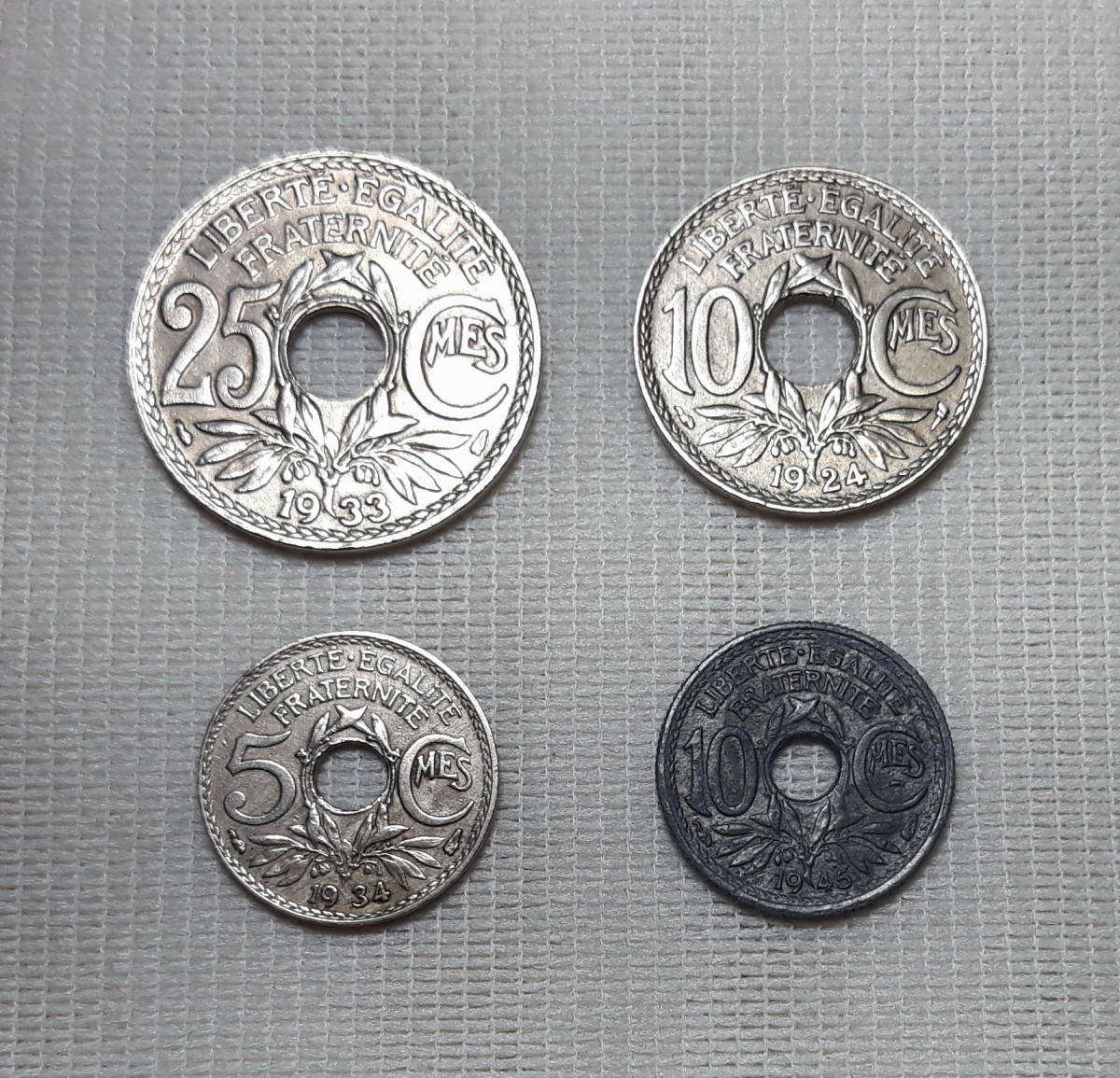 - 1924~ フランス 古い硬貨 4枚 有孔 大戦期含む ◆o-33