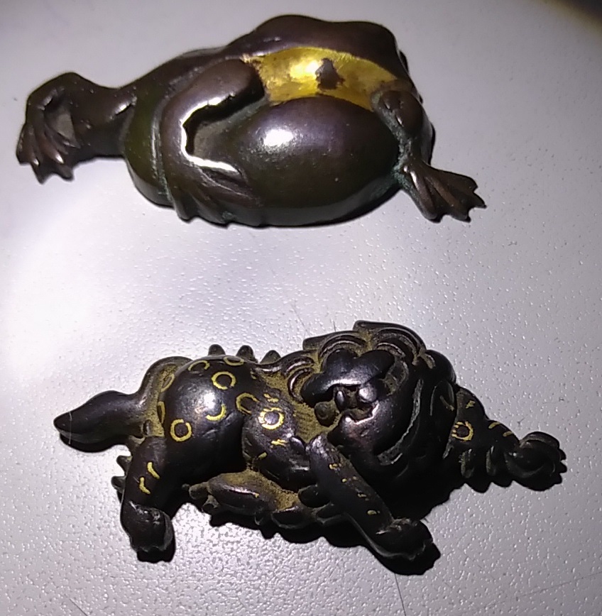 赤銅金象嵌 銅目貫 蛙 獅子 一双
