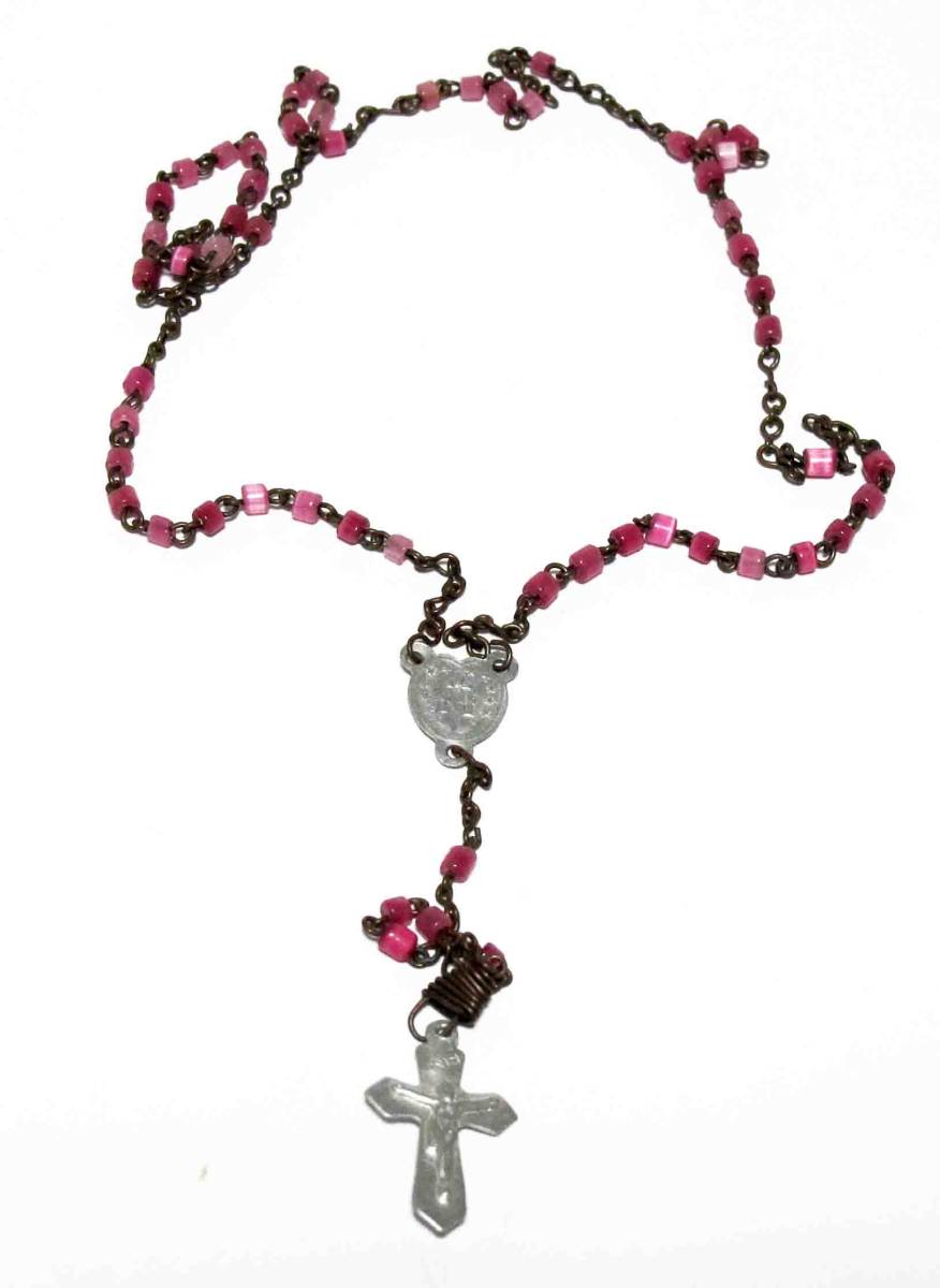 - イタリア製/綺麗な小粒ピンクビーズ/白十字架ロザリオ/守護/70年代ヴィンテージ