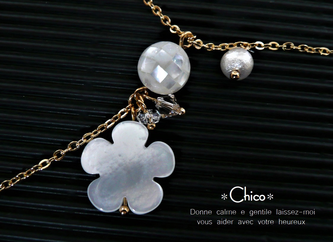 > ●ホワイトシェル フラワーモチーフ・モザイクシェル&クリスタルetc ハンドメイドネックレス ♪ ★2点以上送料無料!★