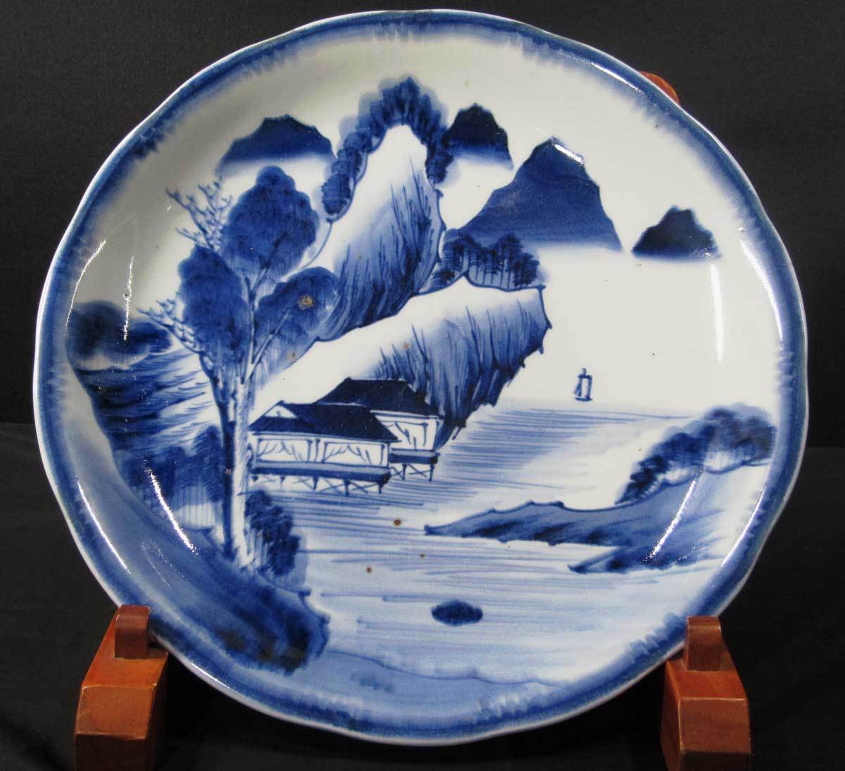 - 有田焼 染付大皿 海辺に民家 径32.8×高5cm