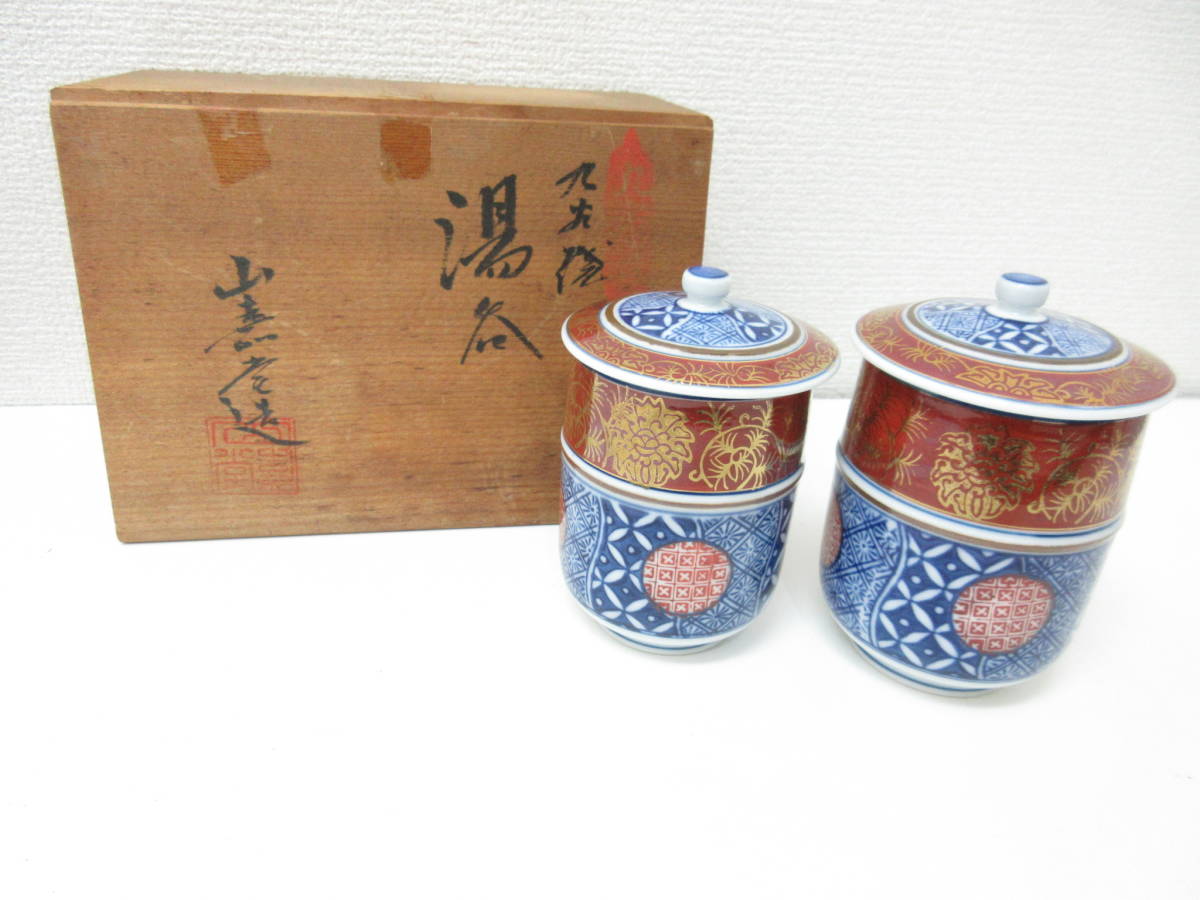 - 極美品■九谷焼 湯呑 蓋付き 夫婦湯呑 組湯呑 2客セット ペア 茶器 湯のみ 加笑 銘あり 木箱 管理1903 U-12
