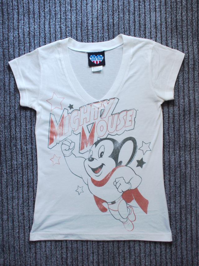 - 中古・ジャンクフード・アメリカ製・Mighty Mouseマイティマウス・Vネック半袖Tシャツ・Mサイズ☆レディース