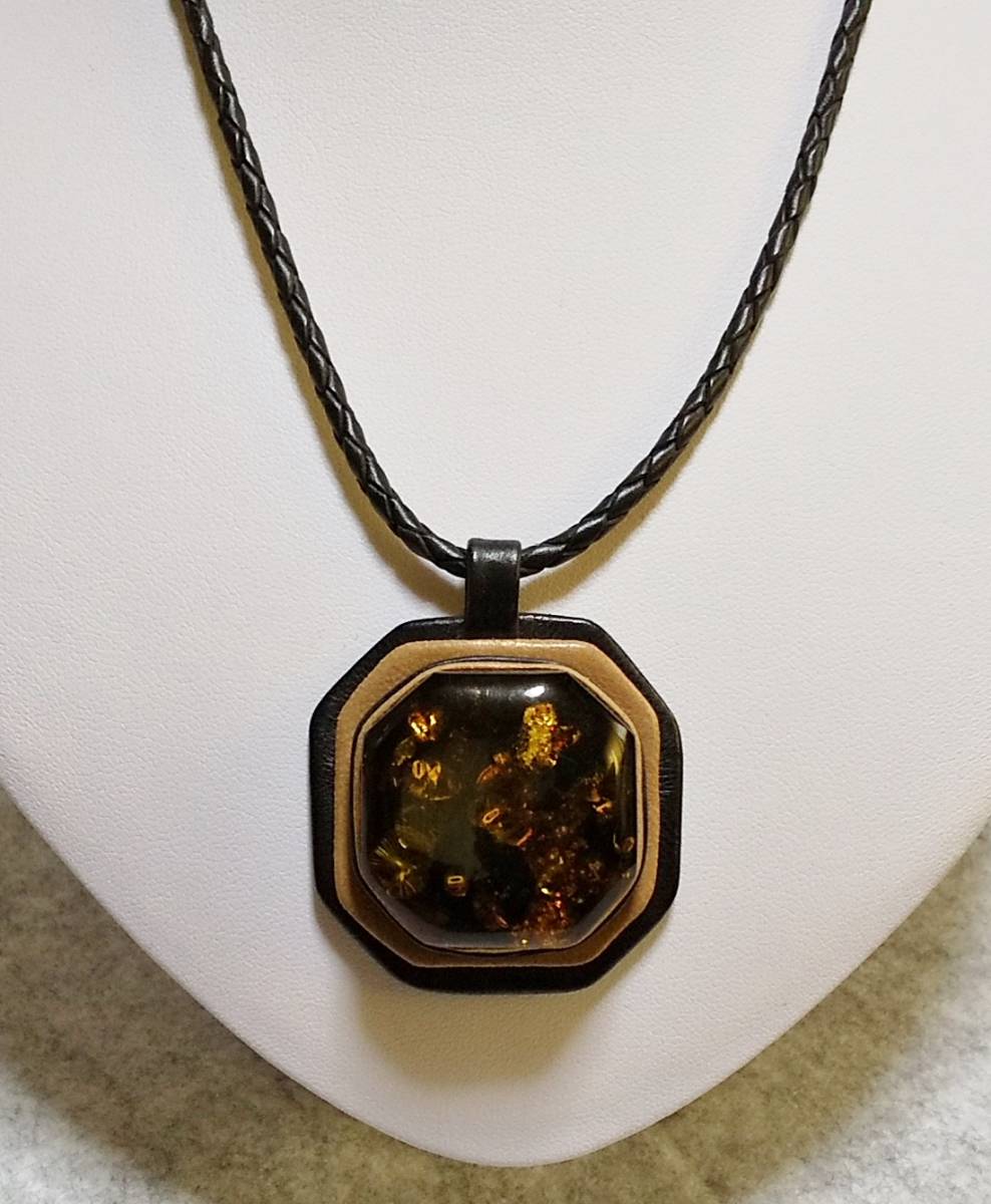 - ★最終80%OFF 琥珀 天然石 レザーペンダント 大粒 マーブルアンバー 正八角形 展示品★F4192