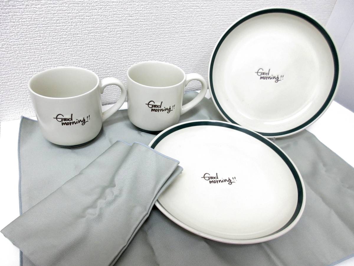 - 極美品■たち吉 モーニングペアセット マグカップ プレート ランチョンマット 2客揃 Good morning 緑 管理1907 L-4