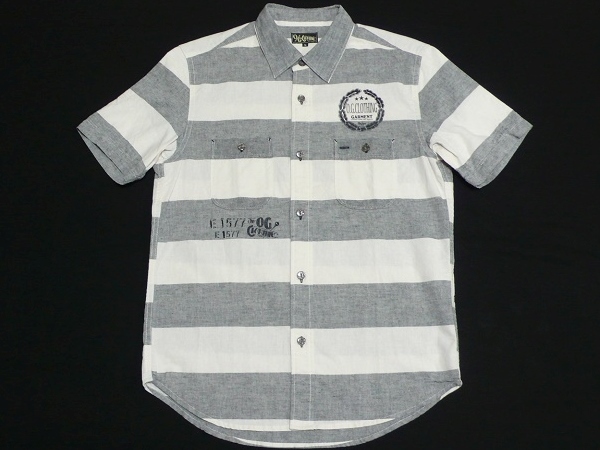 - 美品O.G.Clothing綿麻半袖プリズナーボーダーワークシャツS白x灰日本製\11000