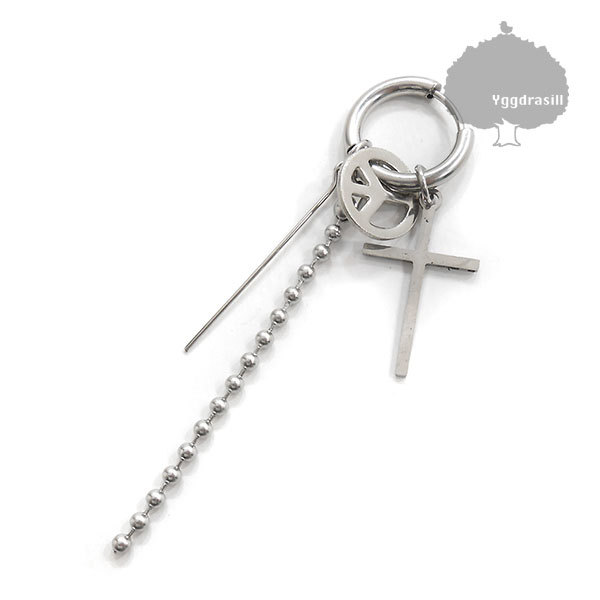 > YGG★新品 PEACE クロス 十字架 バー チェーン 4トップ ピアス 1個 シングル 片耳用 シルバー BTS jimin ジミン着
