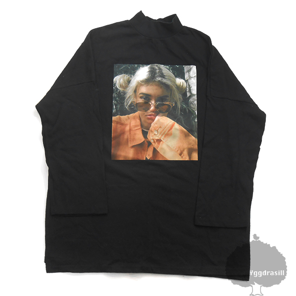 > YGG★韓国製 SYNDROME モックネック 厚手 長袖 Tシャツ ロンT サングラス 女性 フォトプリント 黒 ブラック サイドスリット オーバーサイズ