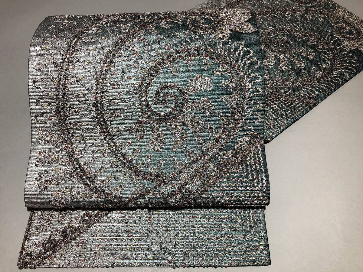 - TO25 中古 袋帯 六通柄 本場大島紬 「無月」MUGETU 泥染 ラメ 銀色地~青碧色地 幾何学蛸唐草文 洒落帯 長4m41cm
