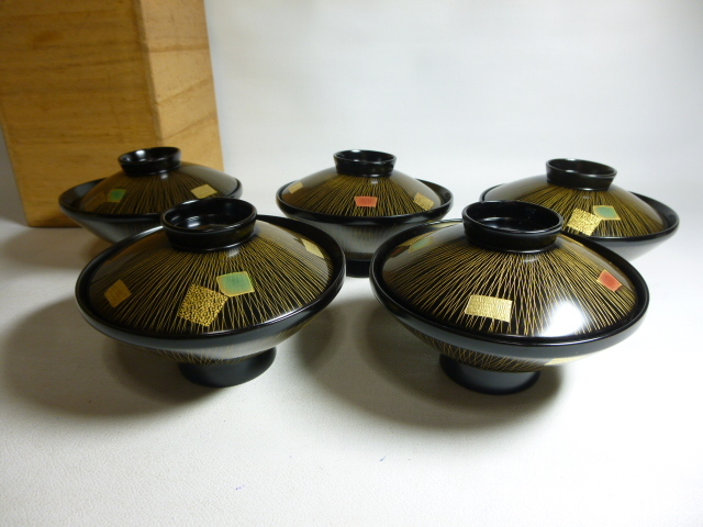 - 旧家から 輪島塗 本堅地 柏葉金銀蒔絵吸物椀 5客揃え 茶道具 /191107