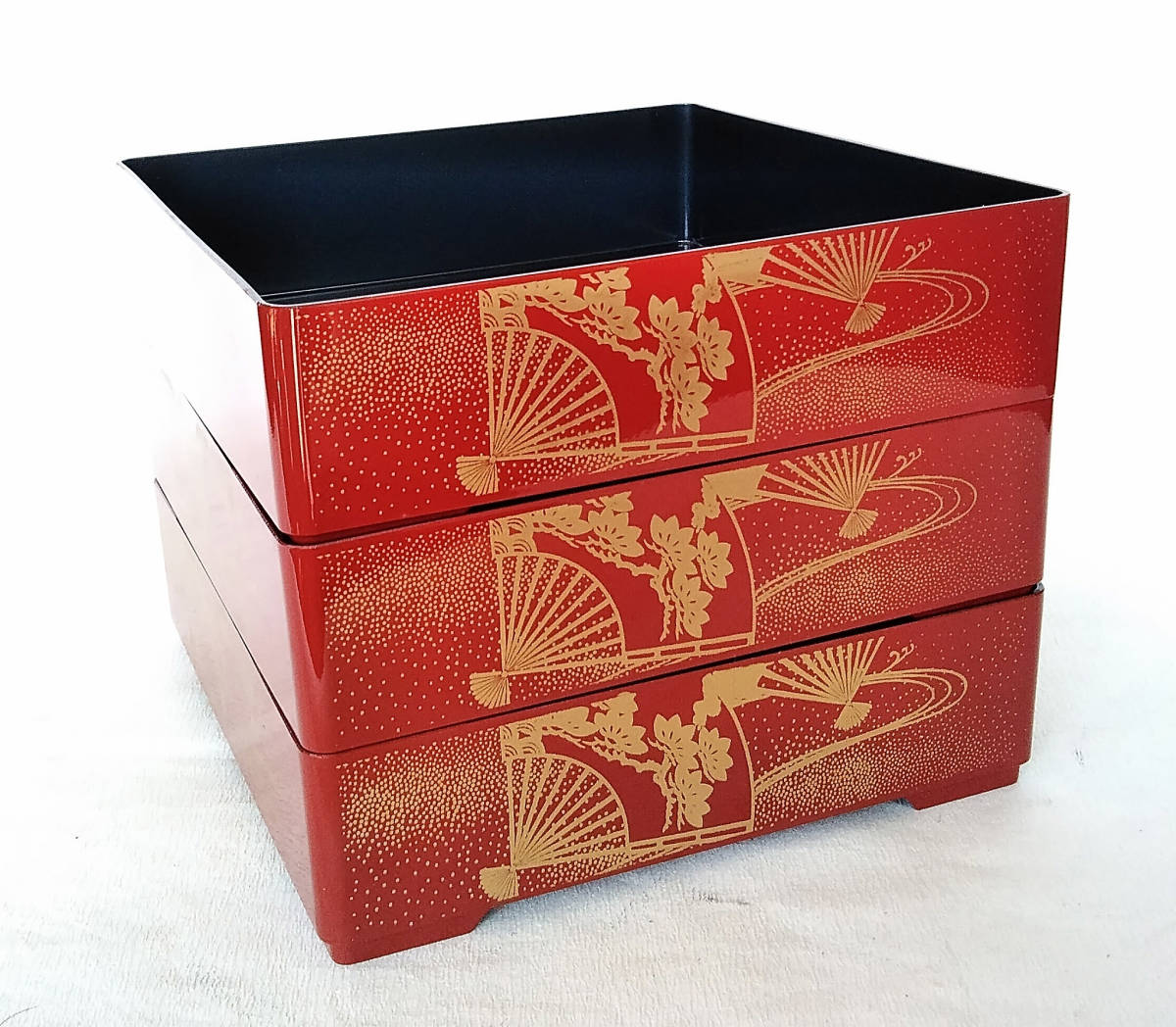 - 重箱 おせち 朱松金扇面 内黒 6.5寸三段重 蓋なし 19㎝ 樹脂製
