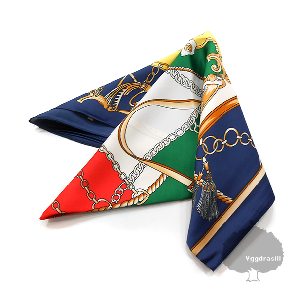 > YGG★新品 大判 ストール スカーフ ホース 馬 チェーン ベルト柄 紺緑赤 70cm×70cm ポリエステル アクセサリー