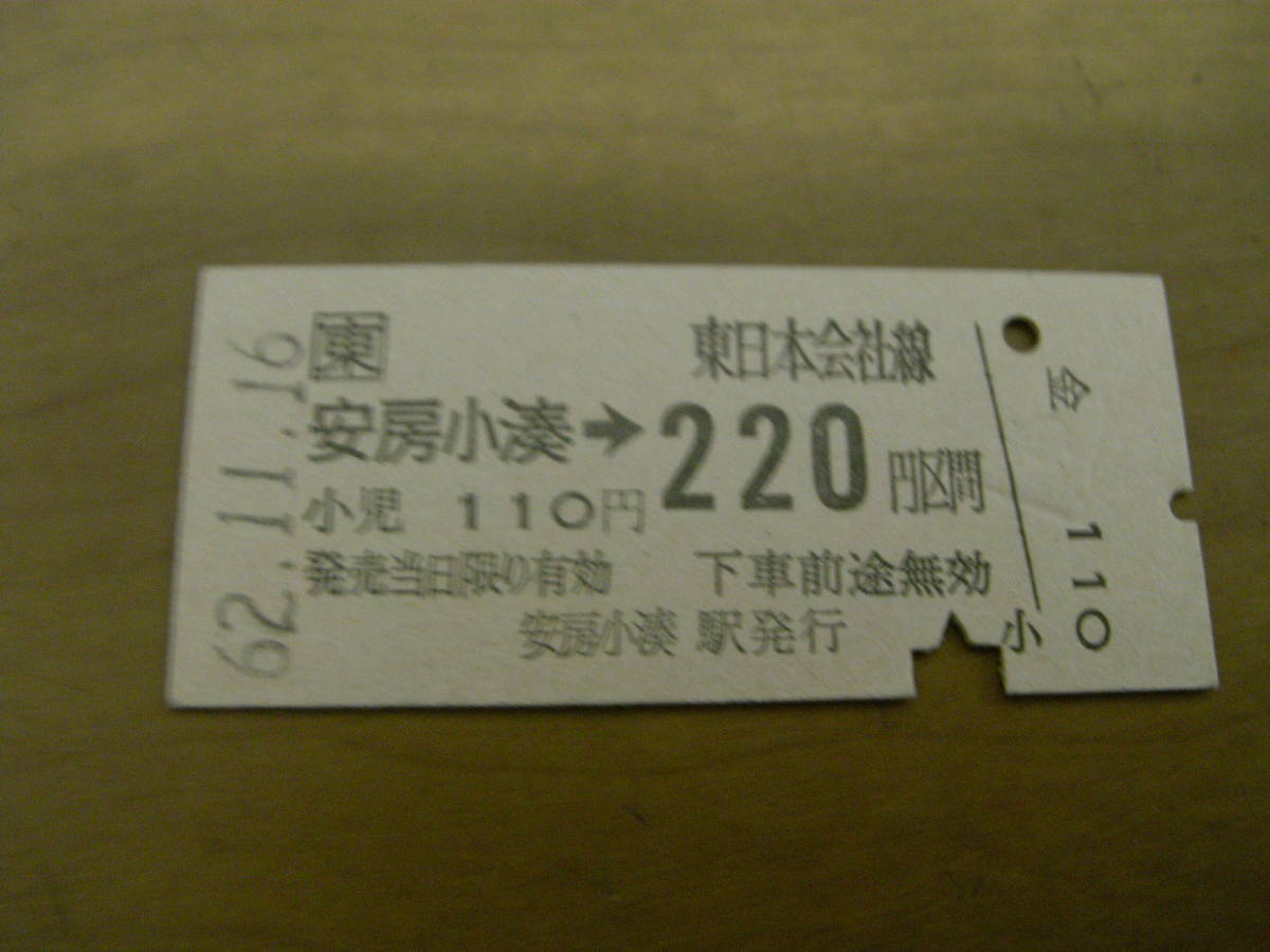 - 外房線 安房小湊→東日本会社線220円区間 昭和62年11月16日 安房小湊駅発行 JR東日本