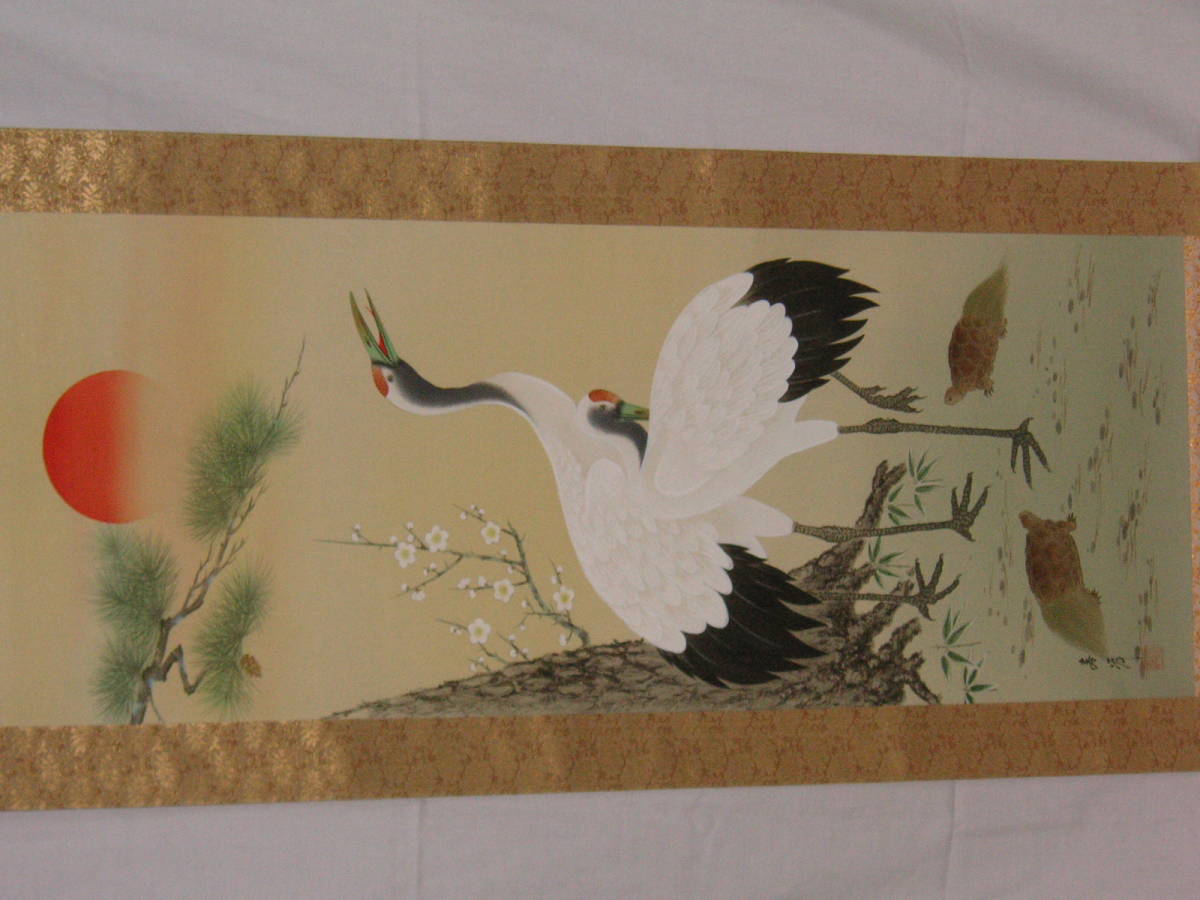- 掛軸 鶴亀 浅野寿峰 半箔金襴 表具状態良い 共箱