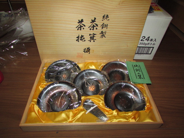 - (レトロな桐箱入り・純銅製茶托い一揃い・梅・竹・欄等模様)龍印有り・昭和レトロ
