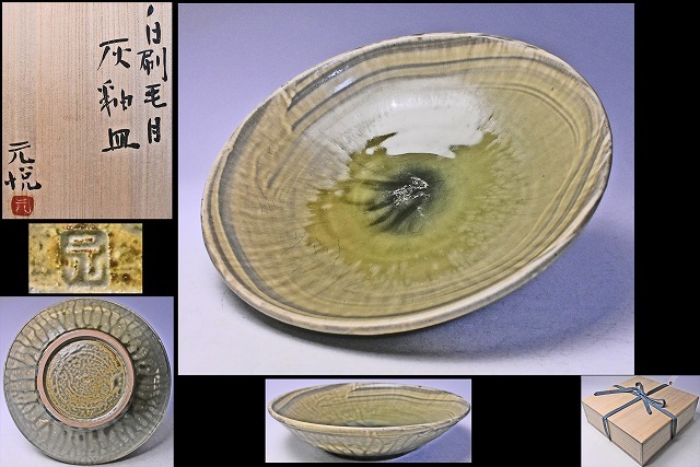 > 柳元悦 ★ 白刷毛目灰釉皿 ★ 共箱 ★ 氏の作品群の中でも特に釉景が美しく存在感のある逸品 ★ 希少 ★検 柳宗悦 ★