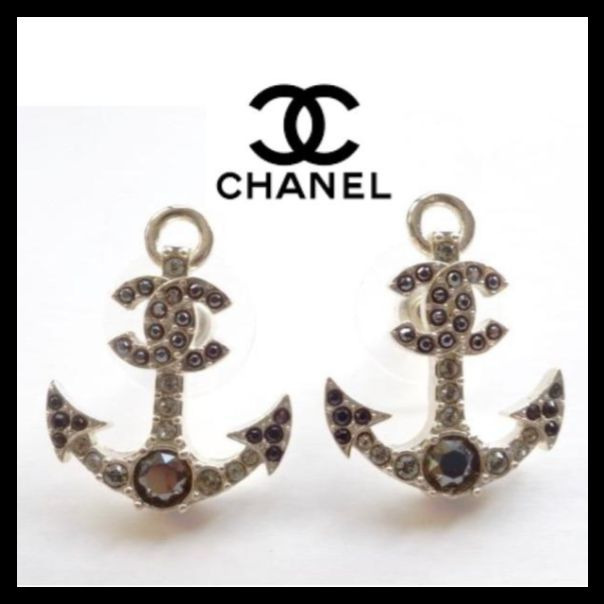 > ● シャネル CHANEL ピアス ココ CC シルバー ラインストーン 黒 ブラック イカリ マリン 新品 箱 リボン 上品 ロゴ