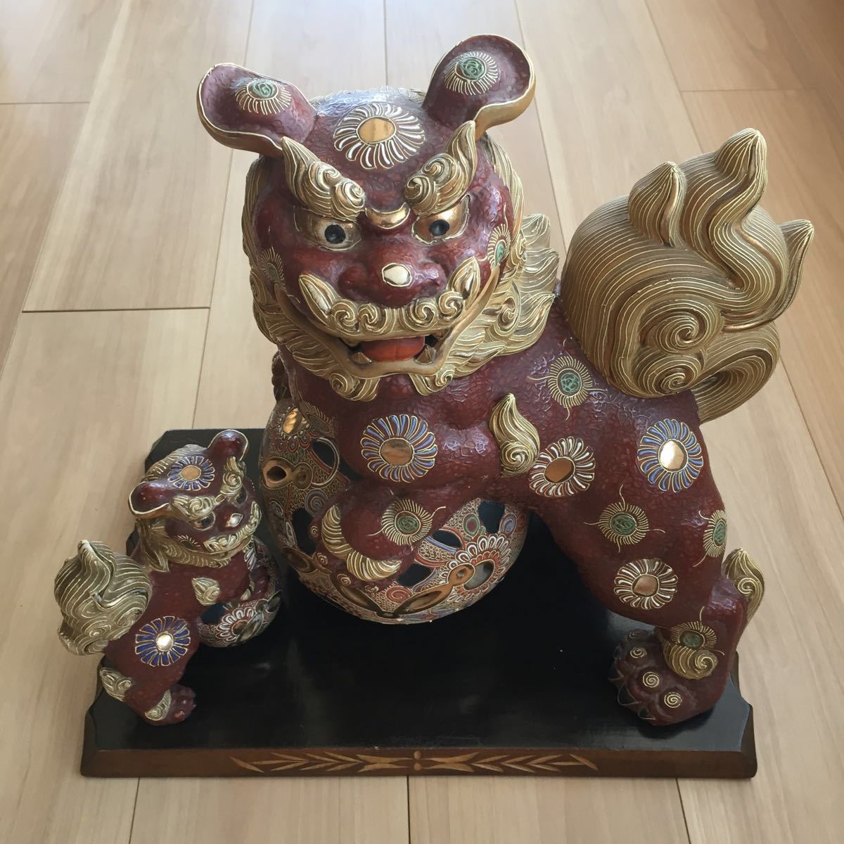 - 九谷 魔除け 獅子 赤獅子 大小 玄関 エントランスに インテリア 置物 華やか ゴールド 鞠 台座