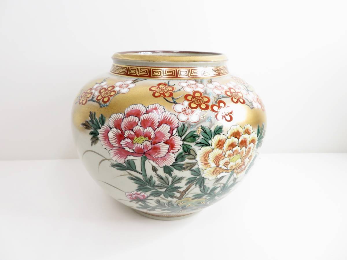 > ◇九谷焼 西田掬翠 花瓶 菊 梅 花柄 陶器 花器 花生 伝統 工芸 金 丸型 美品 管理2004 D-11