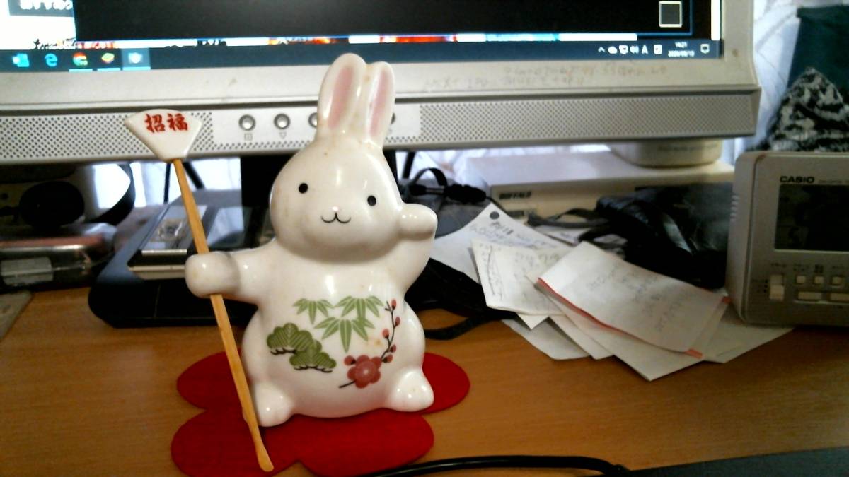 - 招福うさぎ貯金箱 陶器 中国製 ポリエステルフェルトの台座と竹製耳かき付き