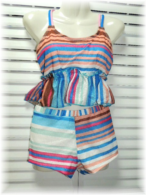 - ショートパンツ型 セパレート水着 11号/L ライトオレンジ系×ボーダー