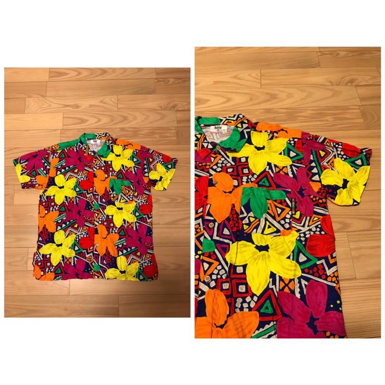 > 個性的古着☆90s Modigliani INNIOR ITALY/モディリアーニ 160メンズサイズL相当 レーヨン POPアート総柄 半袖シャツ 草間&JAMS風 POP色!