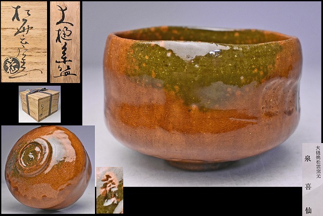 > 泉喜仙(大樋焼松雲窯)★ 大樋釉茶碗 ★ 共箱 ★ 上作 ★ 飴釉の窯変 ★ 楽焼焼成 ★ 飴釉 ★ ヘラ目のアクセント ★