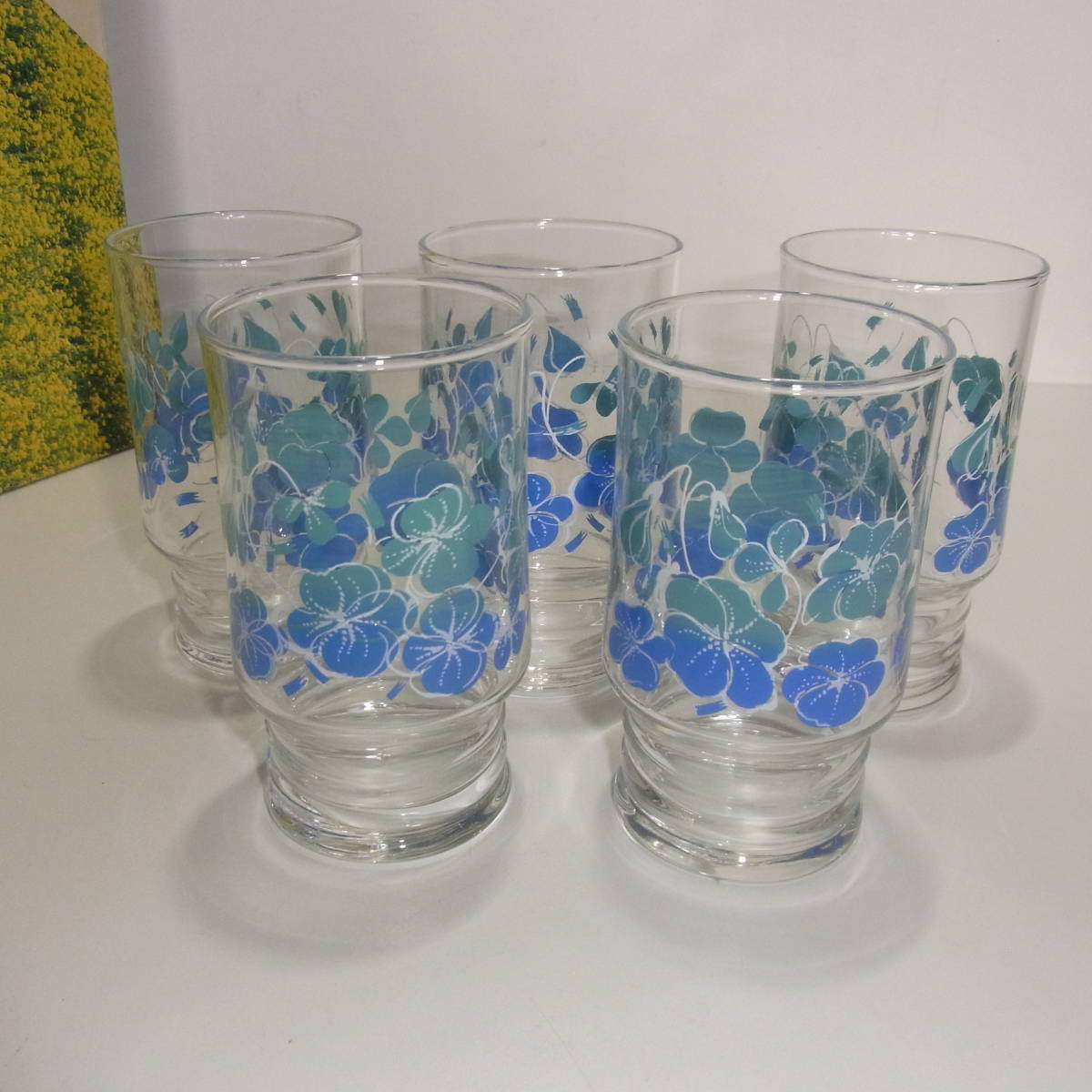 - 佐々木ガラス レトロポップ スタックタンブラー ロベリヤ ブルー花柄 5客セット 未使用 [タンブラー ガラスコップ 昭和 日本製]