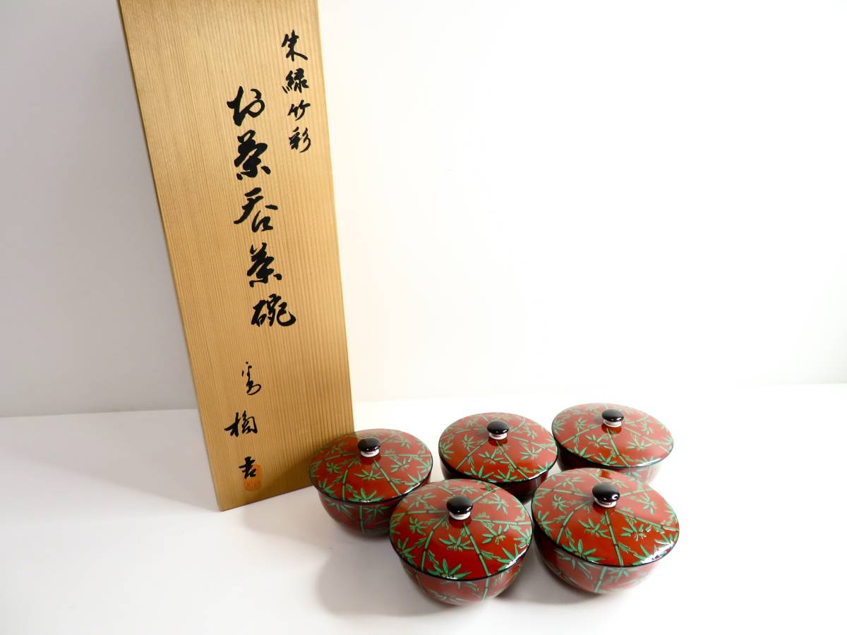 - 未使用品▲TACHIKICHI たち吉 橘吉 朱緑竹彩 お茶呑茶碗 蓋付湯呑み 湯飲み 5客セット 銘あり 木箱入 管理2007 U-4