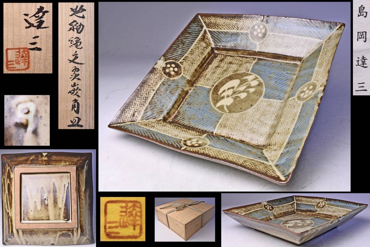 > 島岡達三 ★ 地釉縄文象嵌角皿 ★ 共箱共布栞 ★ 上作 ★ デザイン性抜群 ★ 八寸 ★ 食器に 菓子鉢に★ 益子焼 人間国宝 ★ 浜田庄司師事
