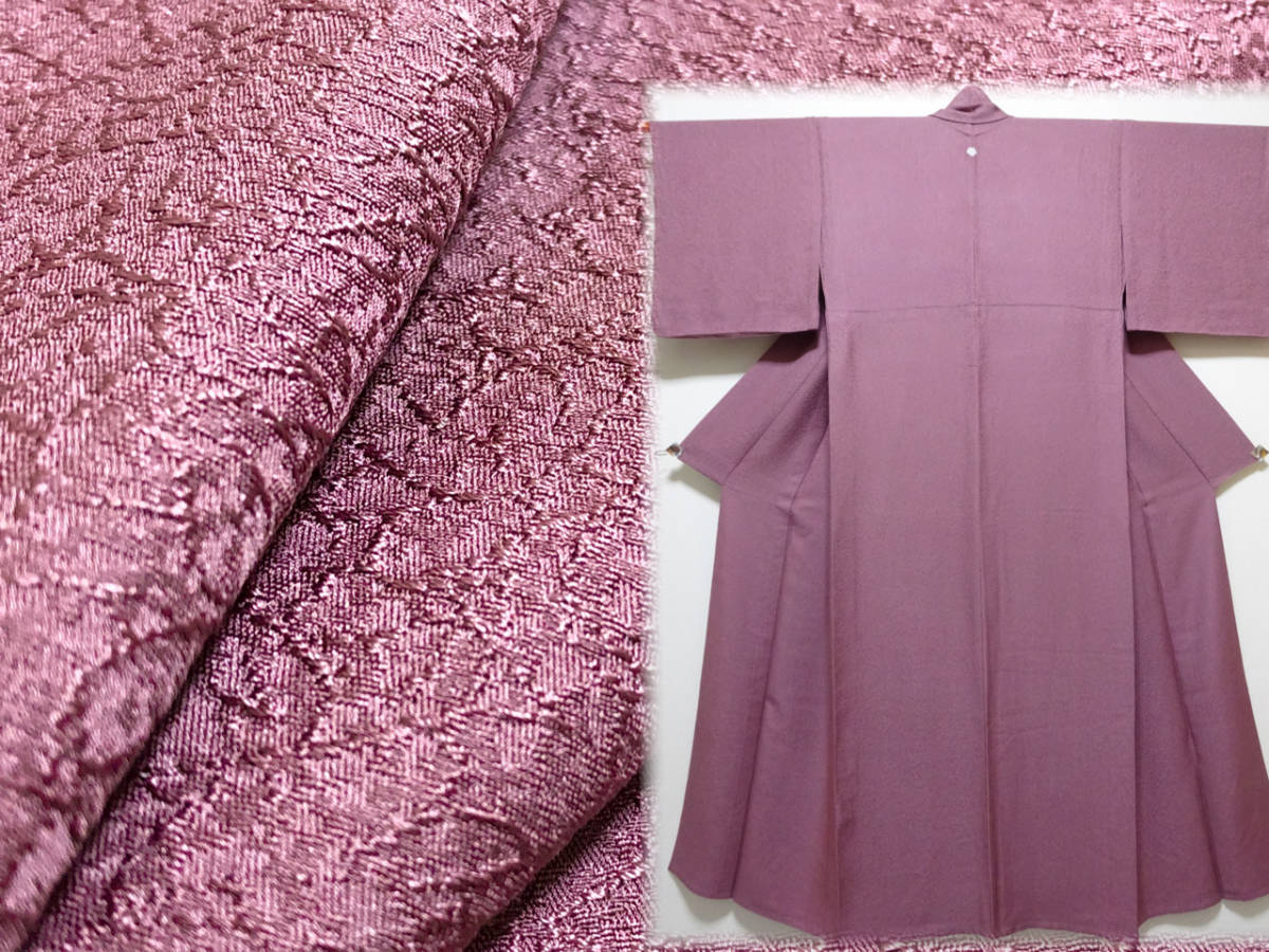- A12 着物 単衣 正絹 色無地 紋意匠 一つ紋 蔦紋 槿花色地
