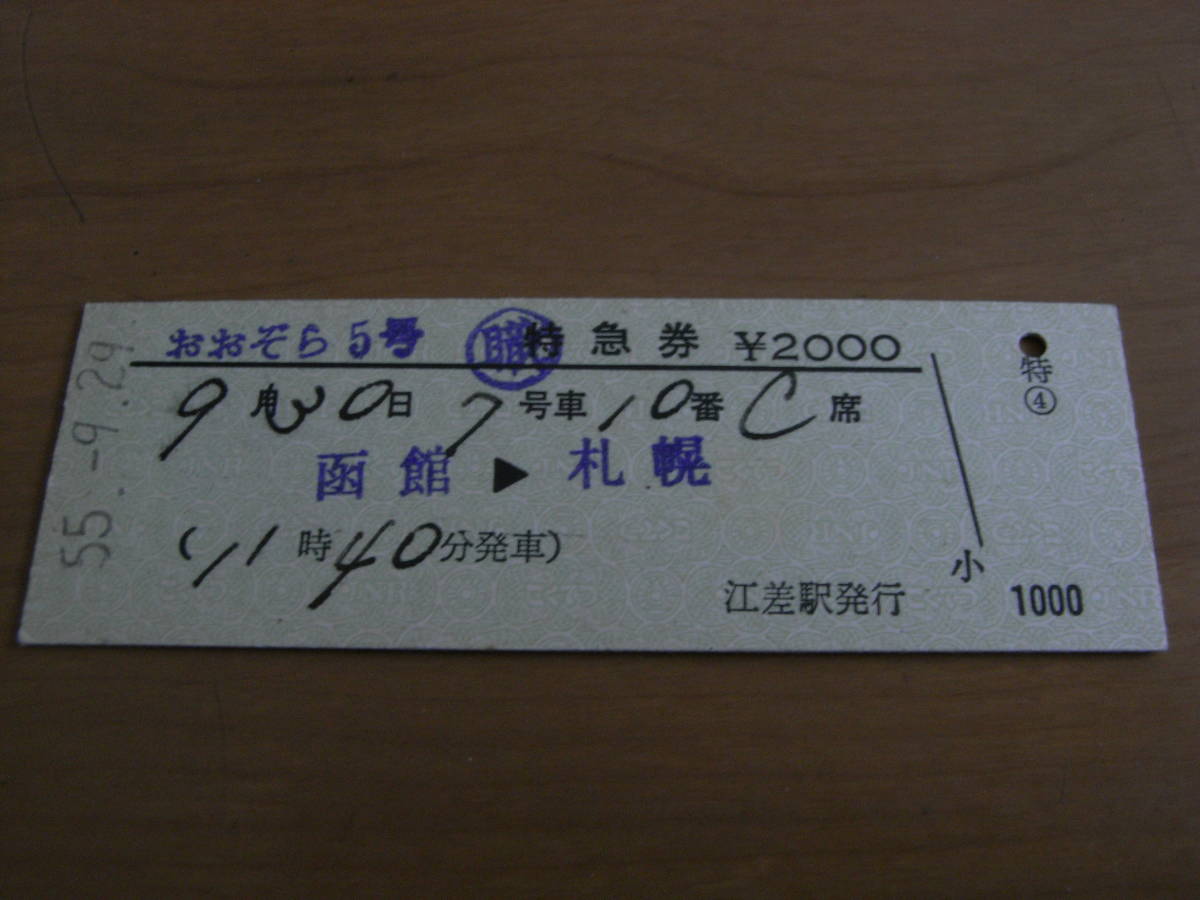- おおぞら5号 特急券 函館→札幌 昭和55年9月29日発行 江差駅発行