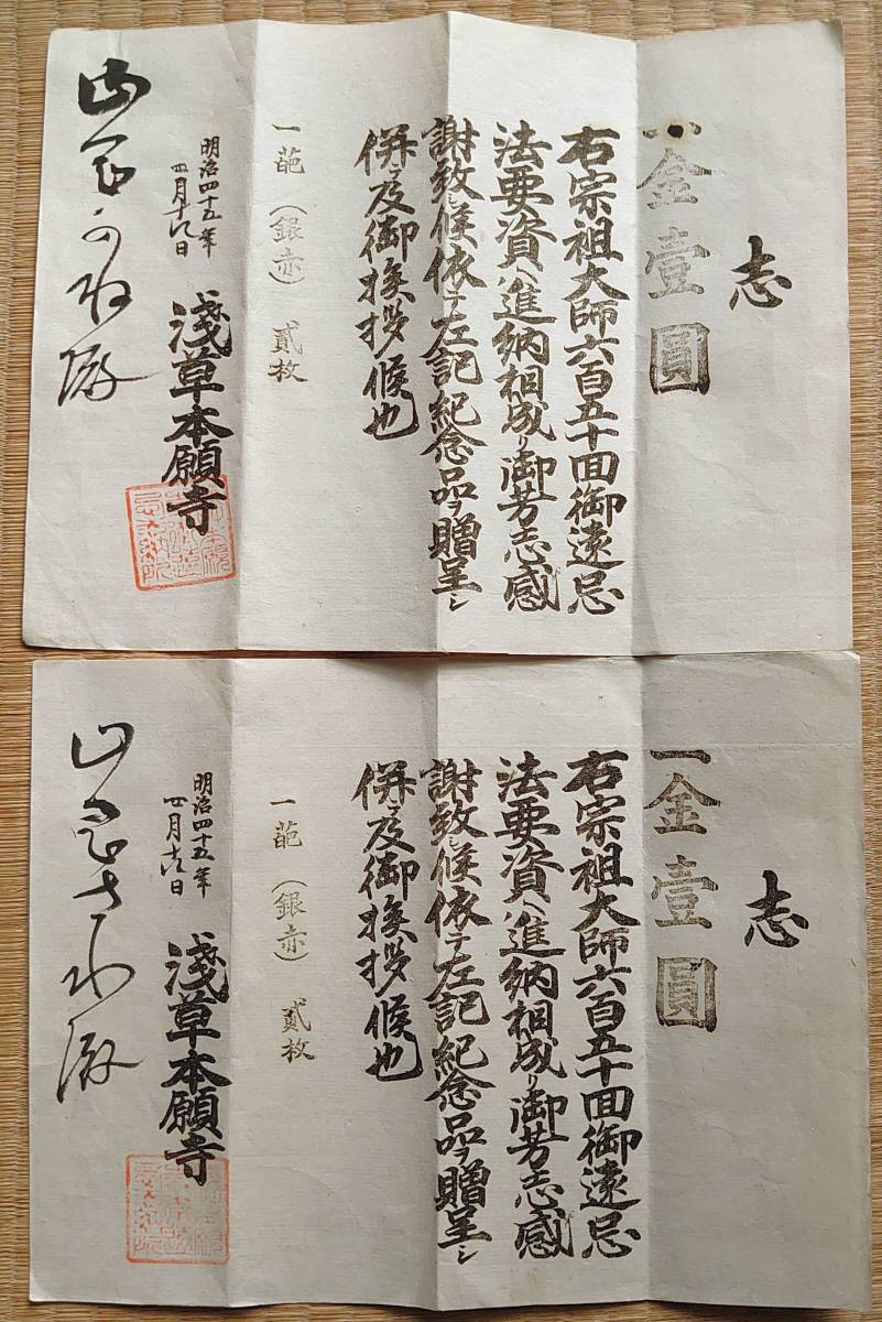 - f20110806〇浅草本願寺 親鸞大師650回御遠忌法要 感謝状 明治45年〇和本古書古文書
