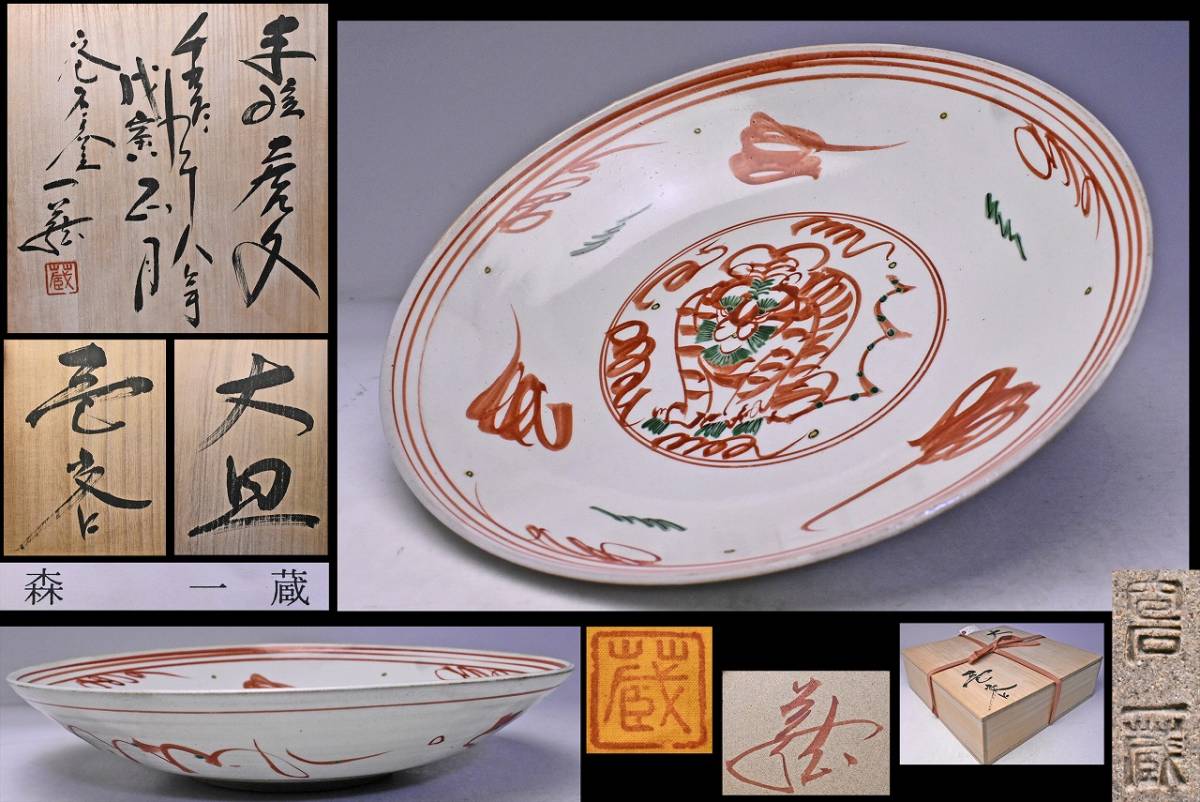 > 森一蔵 ★ 赤絵 虎文 大皿 ★ 共箱 共布 栞 ★ 32cm 尺皿 ★ 愛らしい絵付の存在感ある逸品 ★ 呉須赤絵 ★ 万古焼 萬古焼 ★