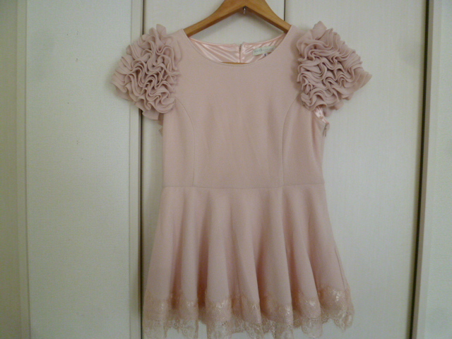 - earth music&ecology/アースミュージック&エコロジー○淡ピンクフリル袖裾レースぺプラム風チュニックワンピースM/半袖ミニ○OP1120