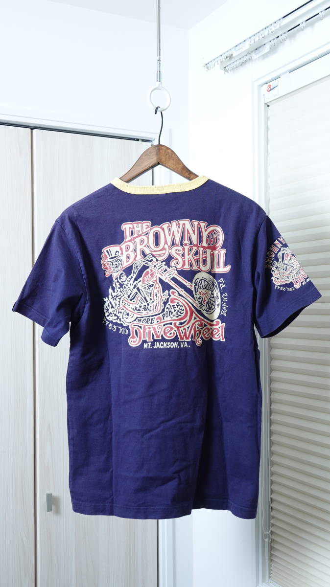 > ★日本製MWS THE BROWNY SKULL プリント半袖Tシャツ 古着ユーズド男性メンズLブルー紺ネイビー40506070Sミッドセンチュリートップス