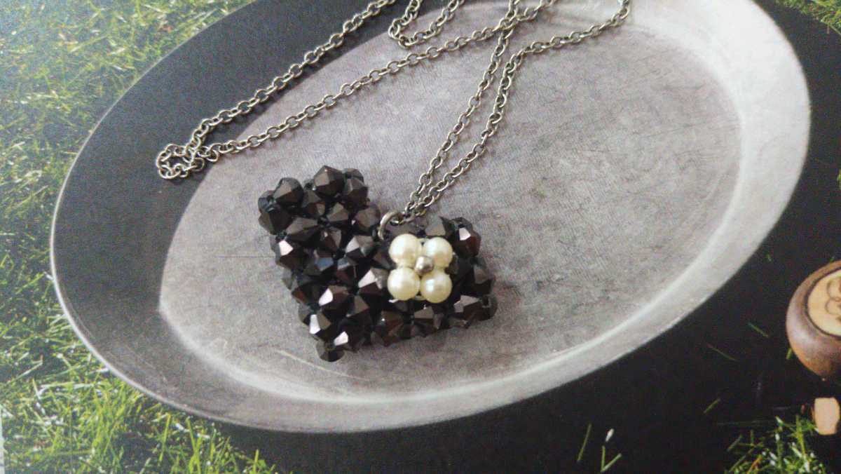 - □多面カットビーズ×ハートモチーフ・ネックレス□黒&パールビーズ□