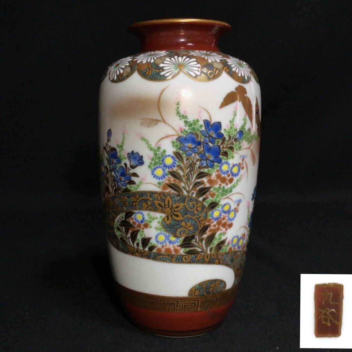 - 初出し 九谷 小さな花瓶 青粒 花と蝶 本金細密画 明治~大正 高さ154㍉
