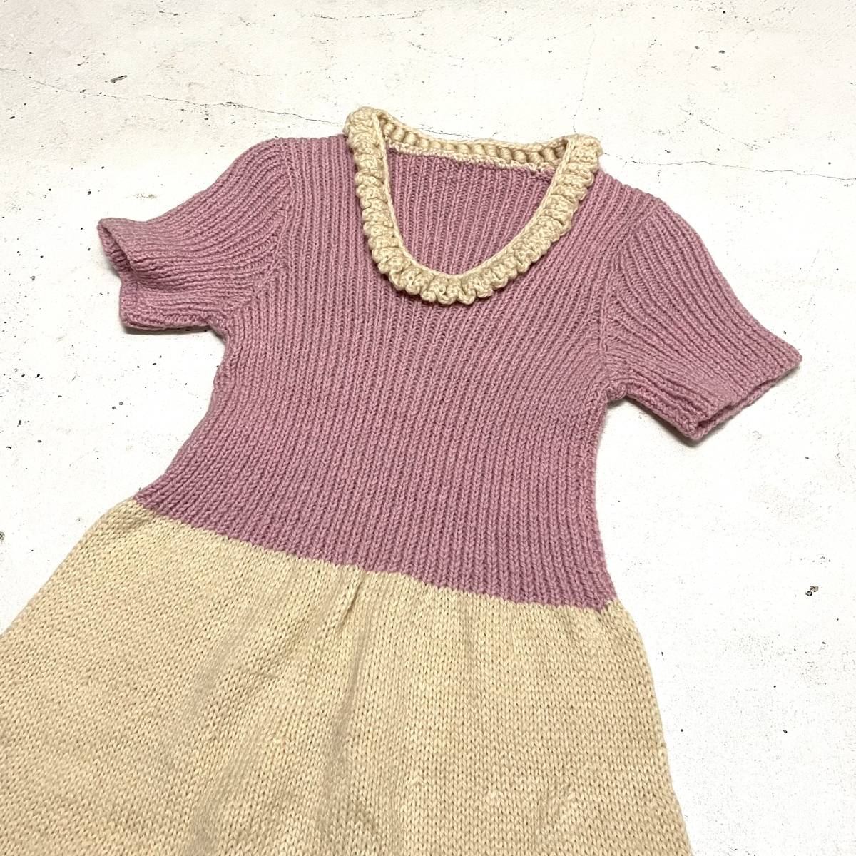 > USA古着 ニット ワンピース 2トーン / 半袖 ローゲージ フリル ピンク 生成り セーター ガーリー フェミニン アメリカ ヴィンテージ