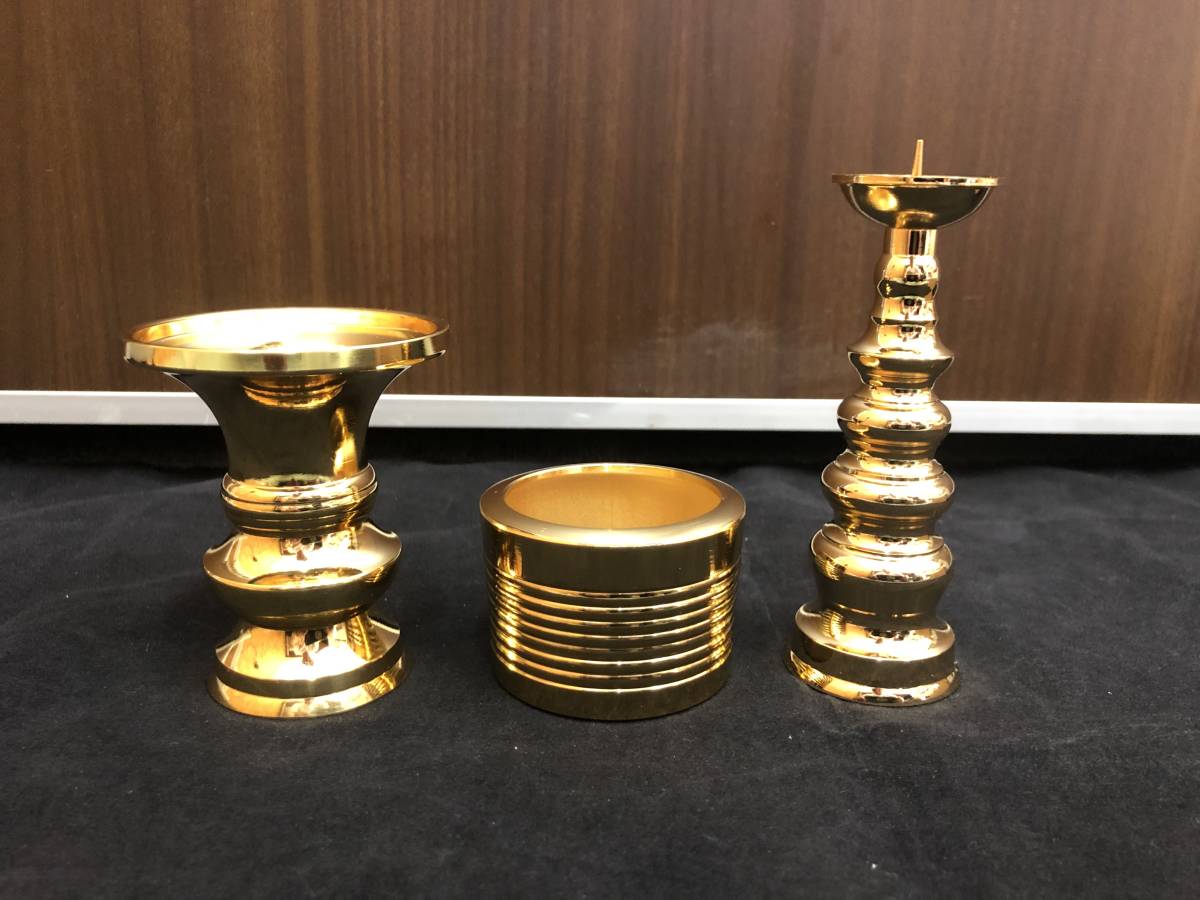 - 本金メッキ 花立 地火燈 桶香炉 各1 仏具 具足 デッドストック品