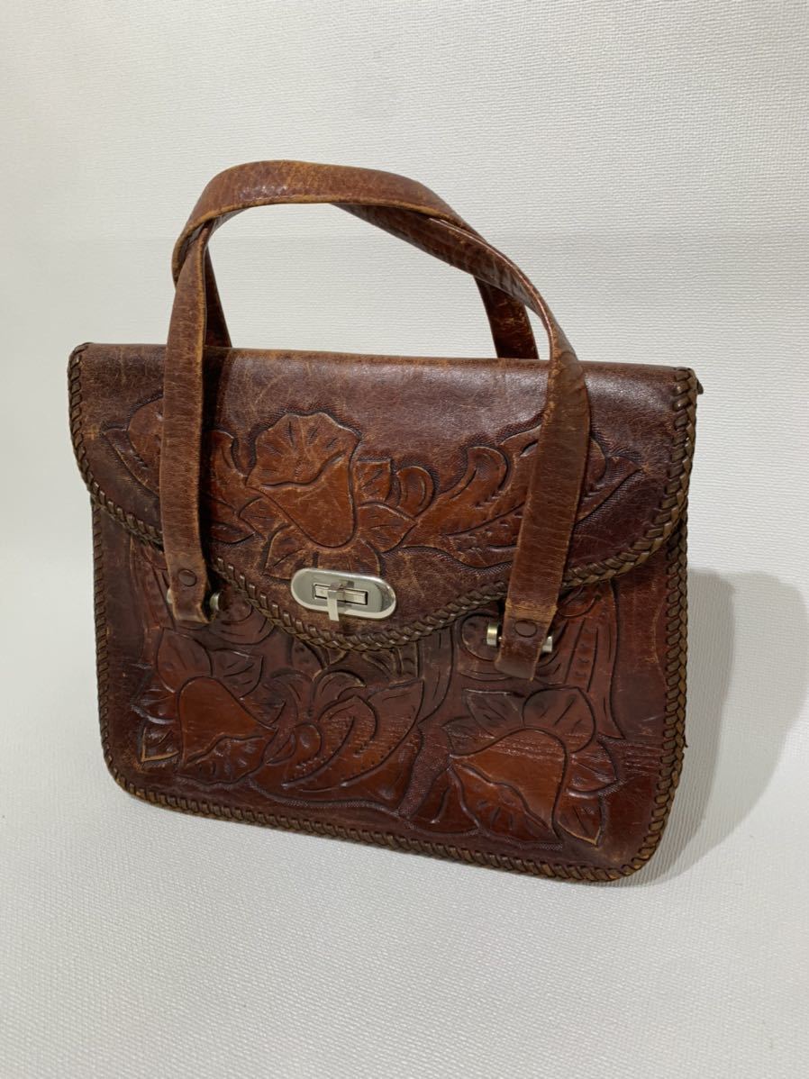- 玄人向け! 激シブ 本革 バック 茶/ブラウン 花 彫り レディース (H112)
