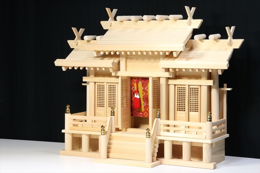 - 美しい、東濃桧■高床仕様 屋根違い 中型 ■御簾と格子扉 ■神棚 (お社本体)高さ49cm×幅64cm×奥行き26cm