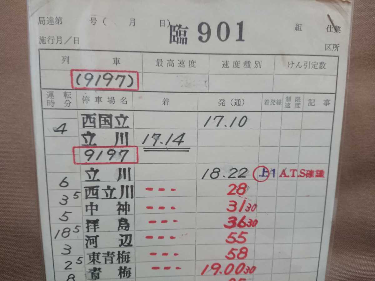 - 動力車乗務員運転時刻表 スタフ 立川機関区? 臨901仕業 9197 9196 西国立-東川井 工臨 ED16?推進運転
