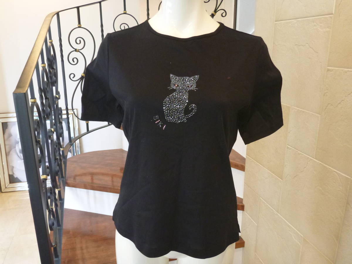 - 新品同様 BIKI ビキ ブティック★ 高級婦人服 黒 ラインストーン 猫 キャット 半袖カットソー Tシャツ 38 M相当