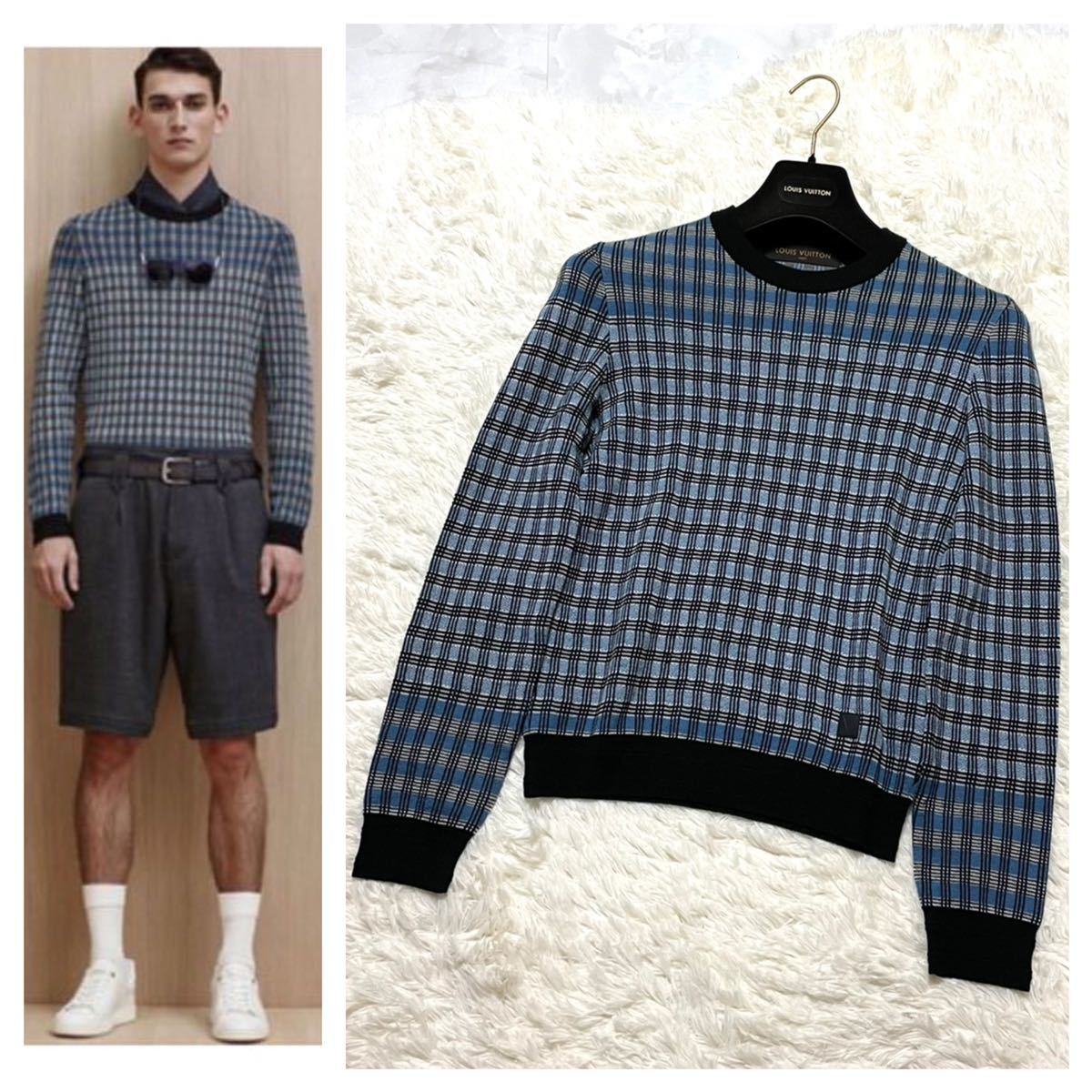 > 本物 美品 名作 ルイヴィトン グラデーションチェック Vレザーパッチ ニット セーター XS 水色 黒 LOUIS VUITTON レターパック配送可