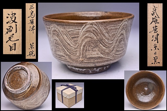 - 時代 ★ 三島唐津 波刷毛目 茶碗 ★ 仕立て箱 ★現川焼を思わせるスピード感のある刷毛目が見事な逸品★ 茶道具 ★ 古唐津 ★