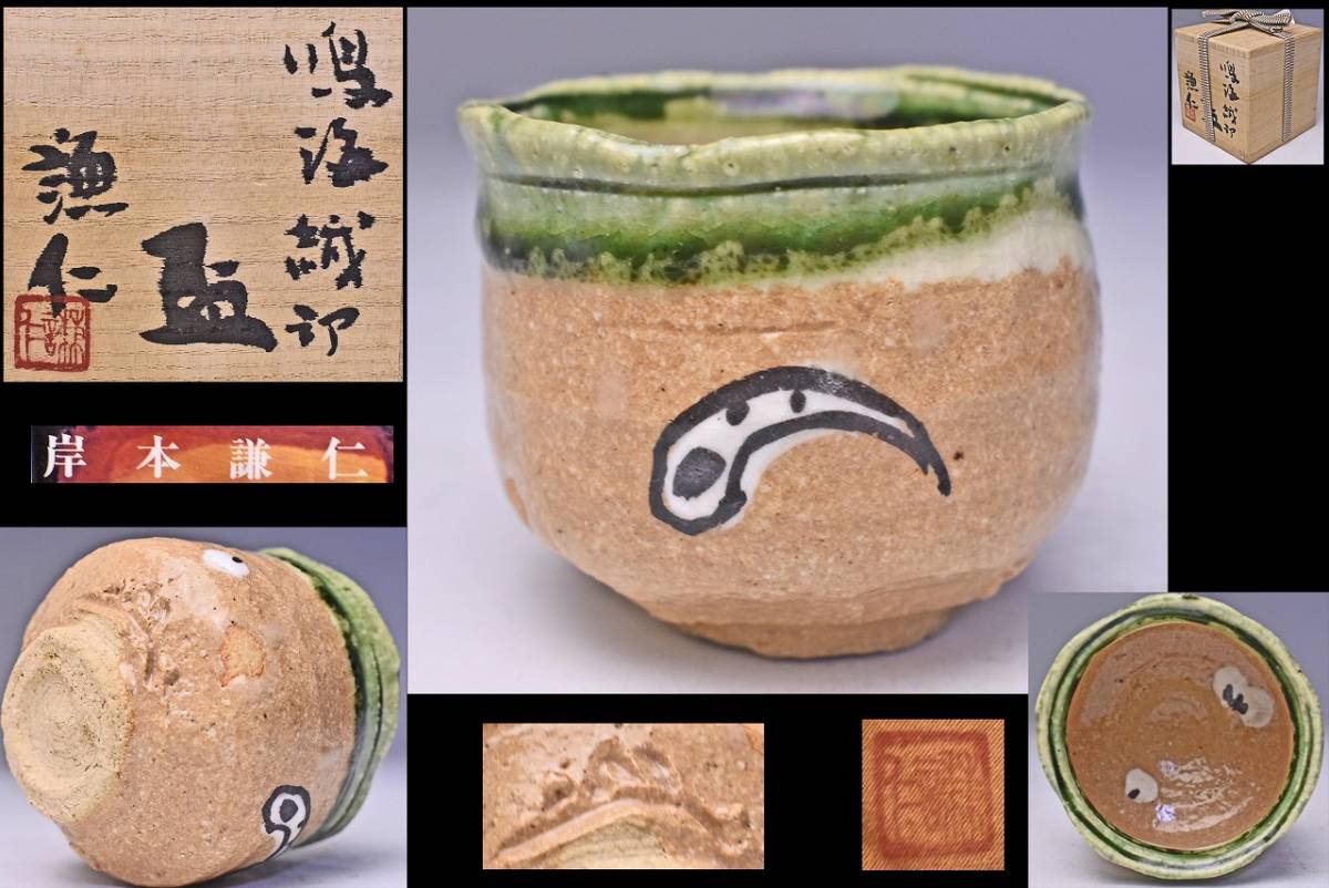 - 岸本謙仁 ★ 鳴海織部盃 ★ 共箱共布栞 ★ 存在感あるぐい呑 ★ 検: 酒器 杯 ★